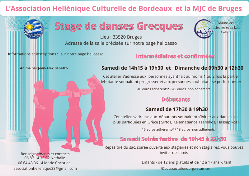 Stage de danses grecques organisé 3 fois par an et proposé par notre association en partenariat avec la Maison de la jeunesse et de la culture de Bruges (33).