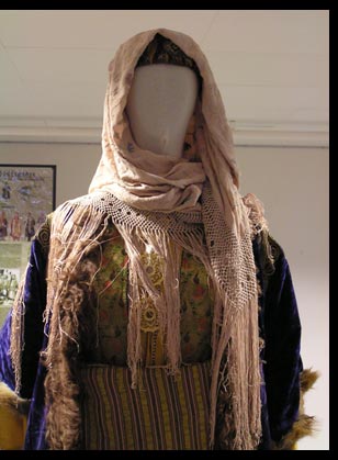 Ile de Kastélorizo Kastelorizo (Méghistis) est l'île du Dodécanèse située le plus à l'Est de la mer Egée. C'est une île ravissante qui comporte, en tout et pour tout, un port en amphithéâtre et une cinquantaine de maisons. Bien que l'île compte peu d'habitants, ces derniers sont très hospitaliers et attendent les bateaux sur le port pour accueillir les visiteurs. Méghisti, ne comporte qu’une seule agglomé-ration située sur la cote Nord-Est de l'île. Les maisons néo-classiques à 2 étages avec leurs portes et fenêtres peintes de couleurs vives, leurs balcons de bois, leurs toits de tuiles, ainsi que les dômes majestueux des églises, sont les témoins de la prospérité passée de l'île. Costumes de Kastélorizo Dodécanèse Ile de Kastélorizo - Méghistis Appartenant à Mme Rivière (Port-de-Bouc) Sur la petite île aride de Castellorizo, les femmes portaient l’habit traditionnel "kavadhi", identique à celui porté dans d’autres régions, aussi bien dans la vie de tous les jours, que pour les grandes occasions, jusqu’en 1950 environ. L’habit de mariage constituait le seul et unique vêtement porté tous les jours par les femmes de l'île. Les tissus et les bijoux de ce riche costume provenaient des quatre coins du globe, ramenés par les riches navigateurs de l’île, au retour de leurs voyages d’Egypte ou d’Australie. La femme célibataire ne portait pas de costume particulier car elle ne sortait jamais de chez elle. Du matin jusqu’au soir, ses seules occupations étaient les travaux ménagers. Les coutumes austères de l’île interdisaient aux femmes célibataires de se montrer à la fenêtre ou sur le seuil de leur maison avant leurs fiançailles qui, de toutes façons, étaient arrangées. La jeune femme ne portait jamais de chaussettes ou de chaussures, ce qui aurait pu laisser penser qu’elle était fragile, risquant de compromettre tout futur mariage. Son costume était très simple, semblable à l'habit de mariage, il en différait par la moins bonne qualité du tissu et l’absence de parure et d’ornementation. En sous-vêtement, elle portait une longue chemise de coton à manches longues, ainsi qu’une culotte (pantalon bouffant). La taille était serrée par une longue ceinture de coton qui recouvrait entièrement le ventre. Par dessus la ceinture, elle portait un gilet de coton ou de laine, identique à celui porté par les femmes mariées. Un châle de laine, jeté sur la tête ou sur les épaules, complétait le costume de la femme cloîtrée chez elle. Vêtue de ce costume, elle sortait une ou deux fois par an, à la sauvette, à 3 heures du matin, pour aller communier. A l’occasion de cette sortie exceptionnelle, elle portait des sortes de pantoufles, sans chaussettes. La jeune fille revêtait l’habit de femme pour la première fois, le jour de ses fiançailles et n’en changeait plus de toute sa vie. Celui-ci comportait le "Kavadhi" appelé tunique dorée, le gilet, la pelisse en peau de renard et de broderies dorées, la culotte (pantalon bouffant), la chemise, la ceinture, les deux paires de chaussettes, les mules brodées d'or et sur la tête, une toque recouverte d'un foulard. La richesse du costume témoignait de l’aisance matérielle des jeunes mariées, de même que les somptueux bijoux, broches, chaînettes, boucles d’oreilles, bracelets aux poignets et bagues aux doigts. Les bracelets et les bagues qu'elles mettaient étaient si nombreux qu'ils couvraient les avant-bras jusqu'aux coudes et les doigts jusqu'aux dernières phalanges, à tel point que les doigts ne se pliaient plus. Les femmes marchaient toujours les bras croisés devant la poitrine et leurs doigts brillaient du fait de la présence des bagues. Comme seule et unique parure, elle portait des broches et des boucles d’oreille composées de trois pièces d’or, pendues à ses oreilles percées depuis sa plus tendre enfance. |