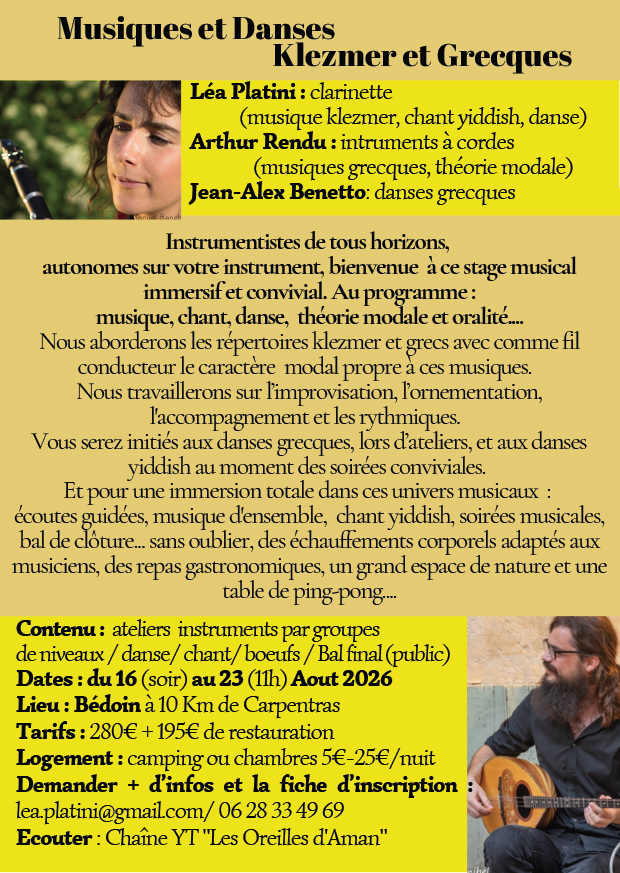 Samedi 22 Aout, 20h : Bal grec avec Jean-Alex Benetto / partie danses yiddish avec Léa Platini Entrée 5€.
