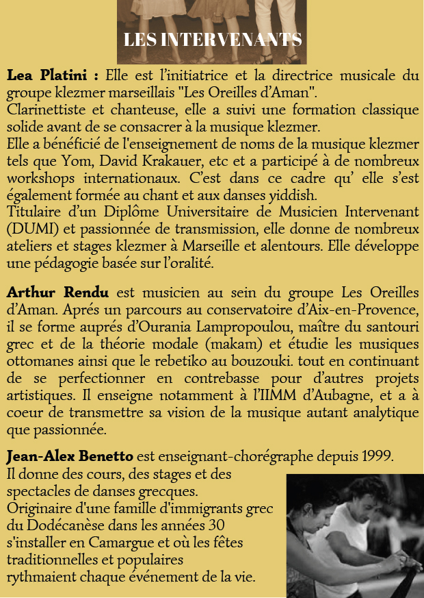 Léa Platini : clarinettiste et chanteuse, fondatrice du groupe de musique klezmer “Les Oreilles d’Aman”, elle se forme aux danses yiddish et les intègre dans son enseignement.